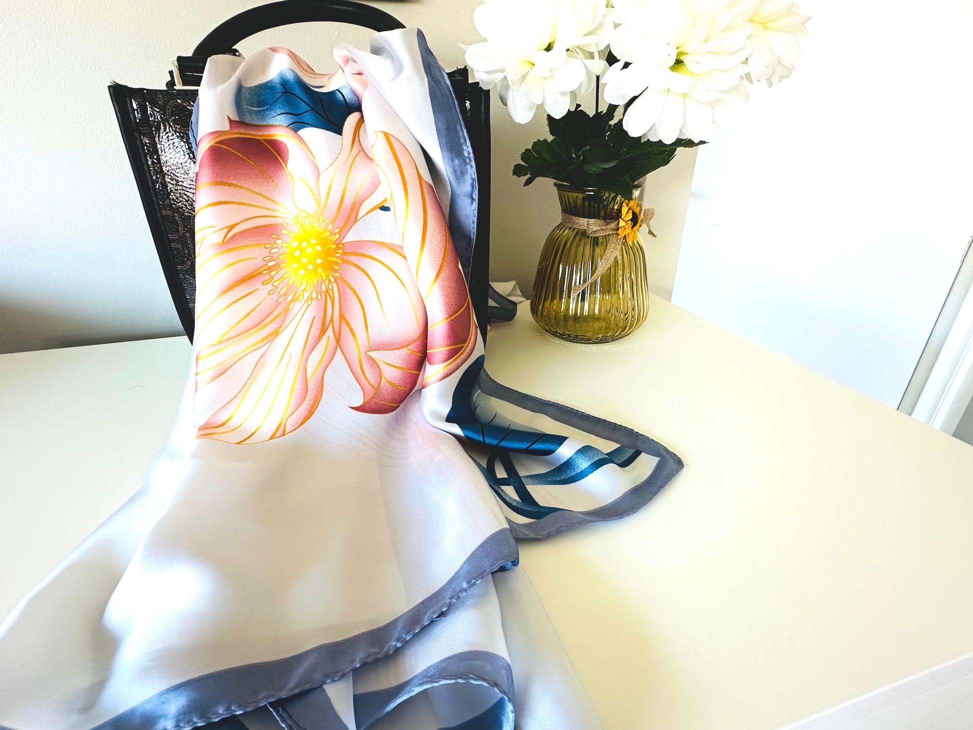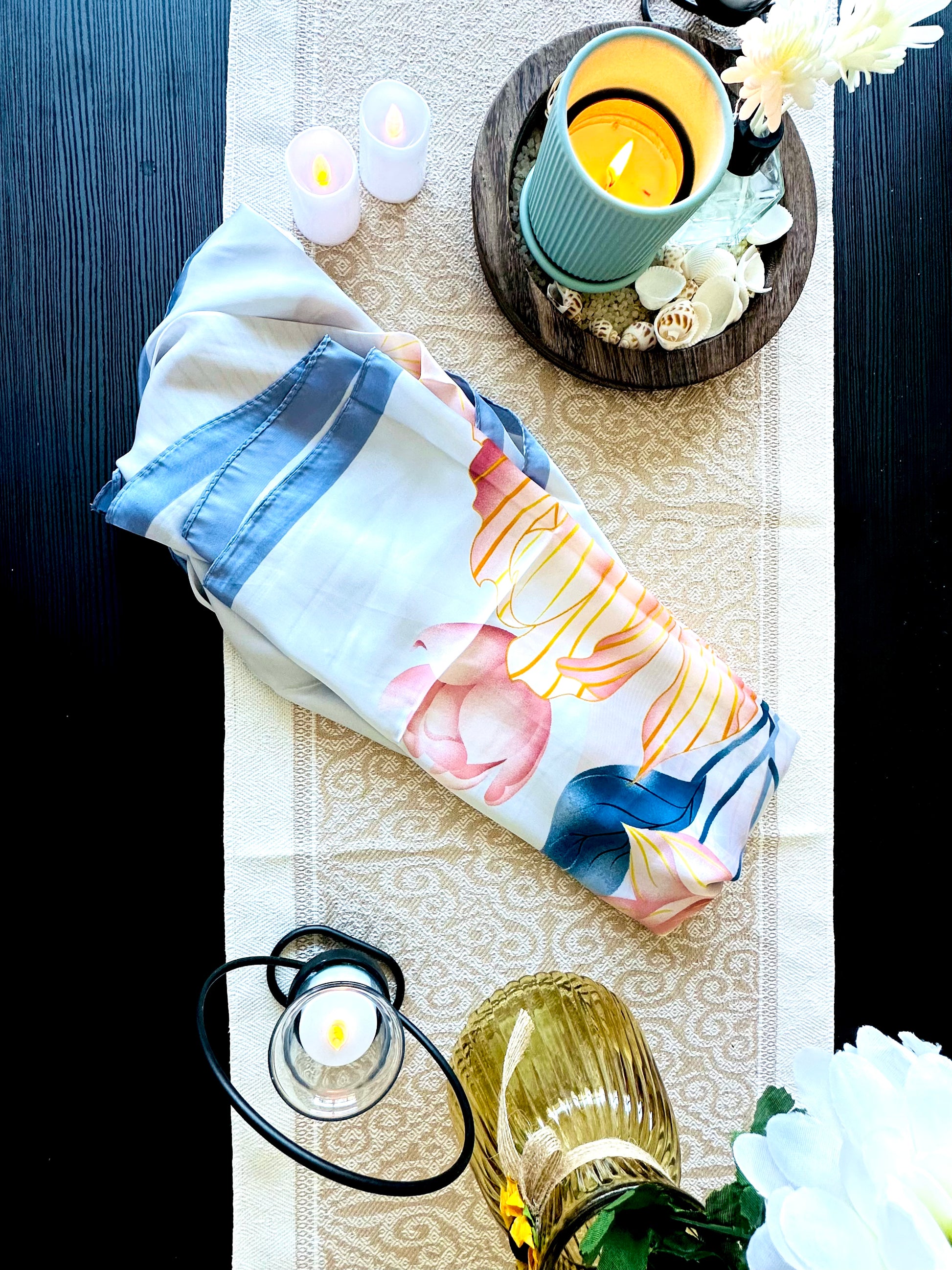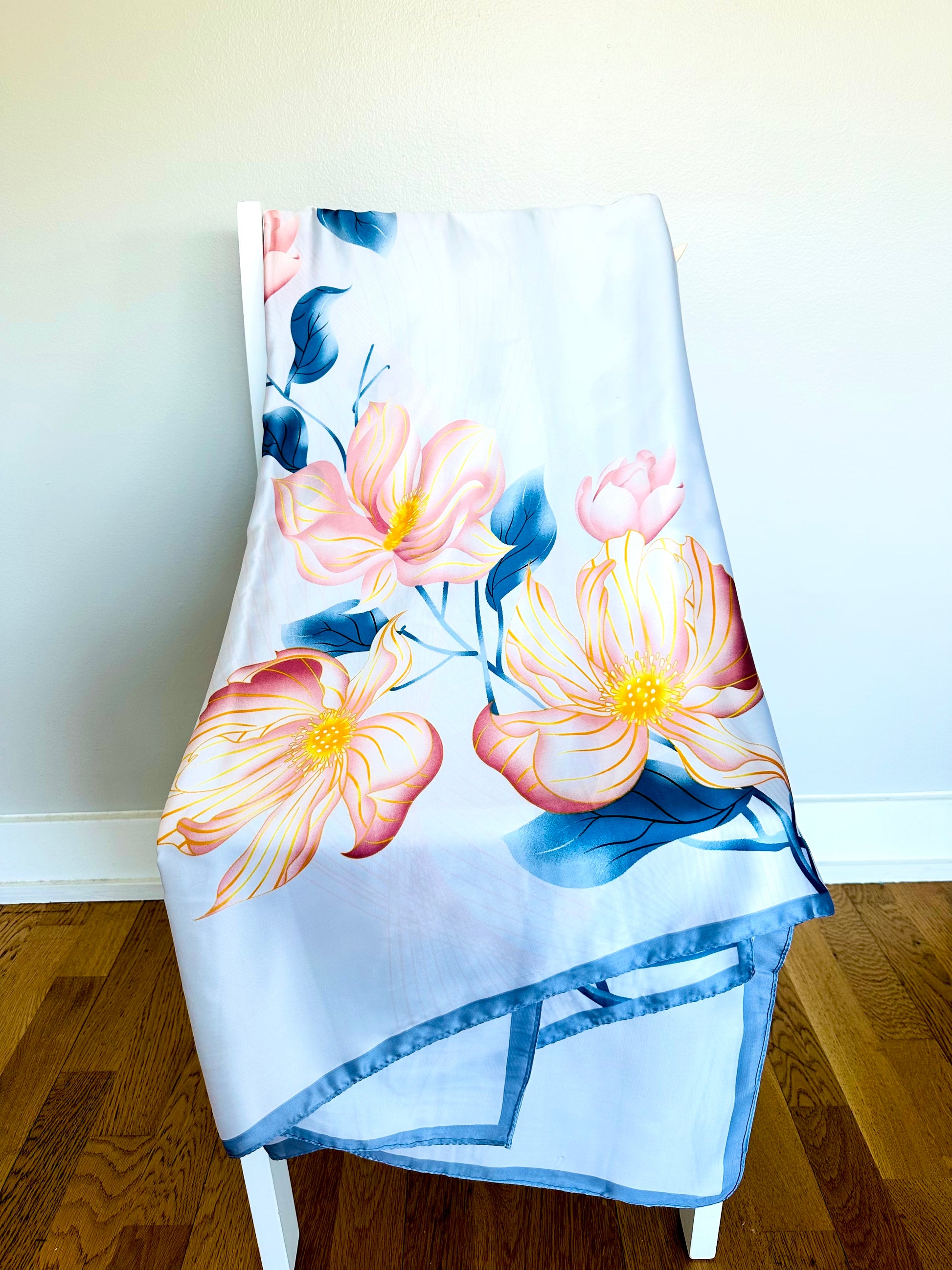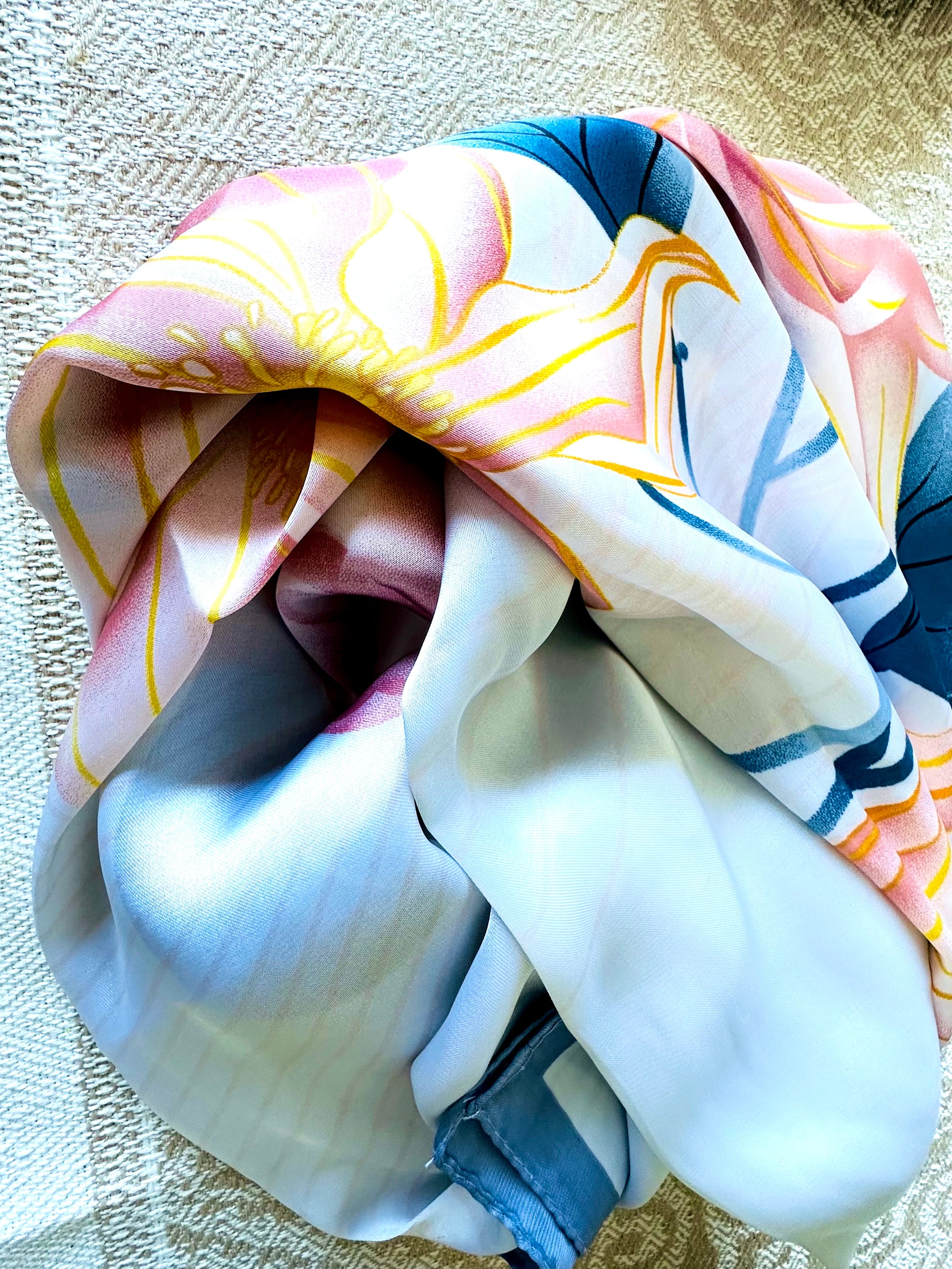 Cool and captivating, Inspired by the calm of a twilight sky, the Printed Scarf in Sapphire Mist combines cool sapphire blues with dreamy grey undertones in a mist-like abstract design. Like morning fog rolling over still waters, this scarf adds a calm elegance to your outfit — subtle yet striking