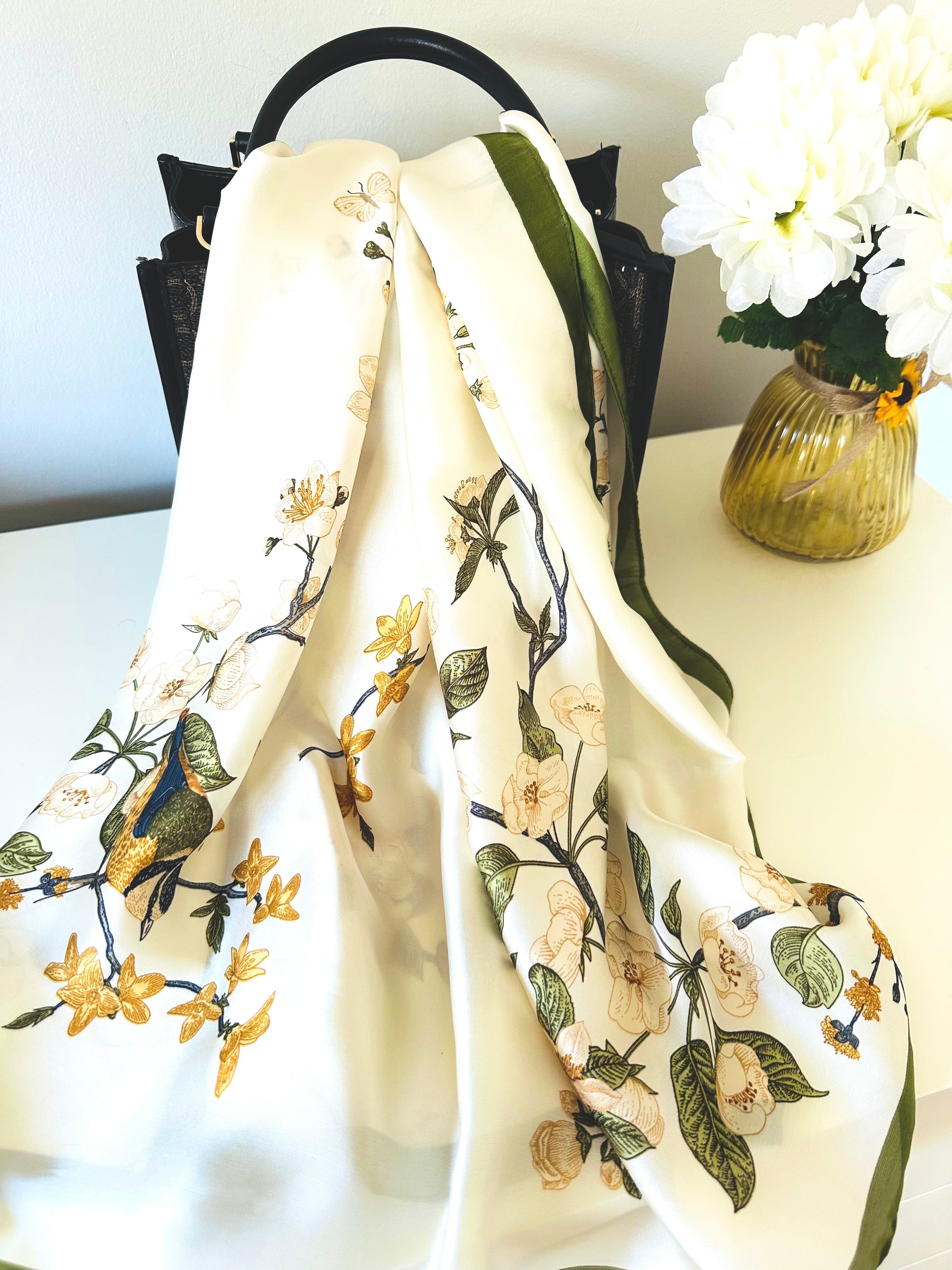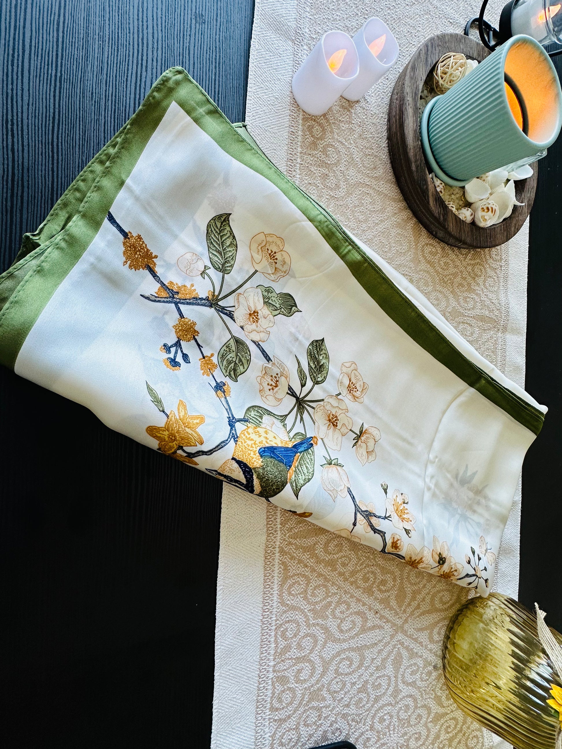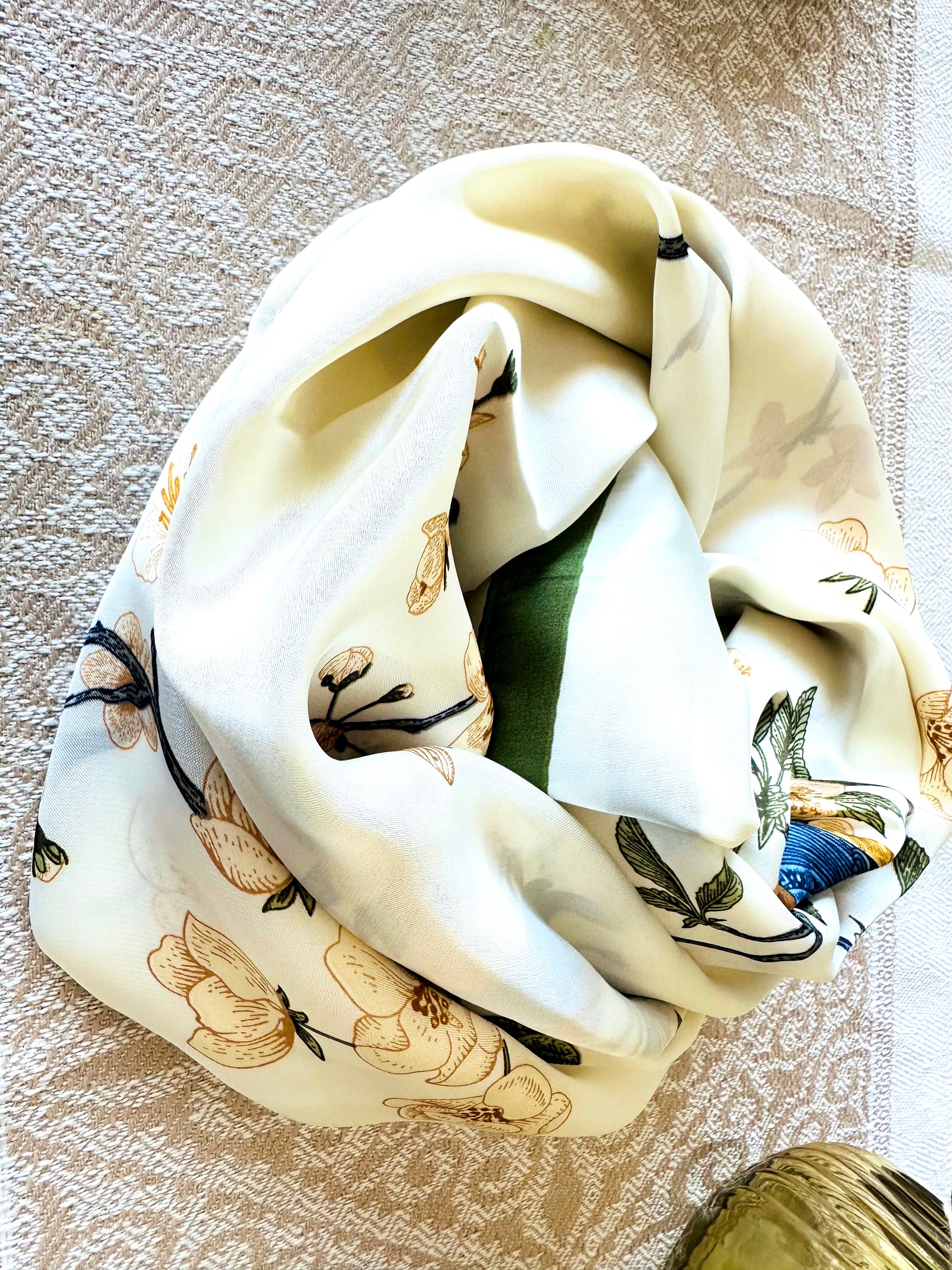 Step into nature’s embrace with the Printed Scarf in Lush Canopy. Inspired by the richness of nature, Lush Canopy envelopes you in deep green tones and organic prints. Rich green hues intertwine with soft leafy patterns, reminiscent of a peaceful forest under dappled sunlight. It’s earthy, grounding, and full of quiet strength.