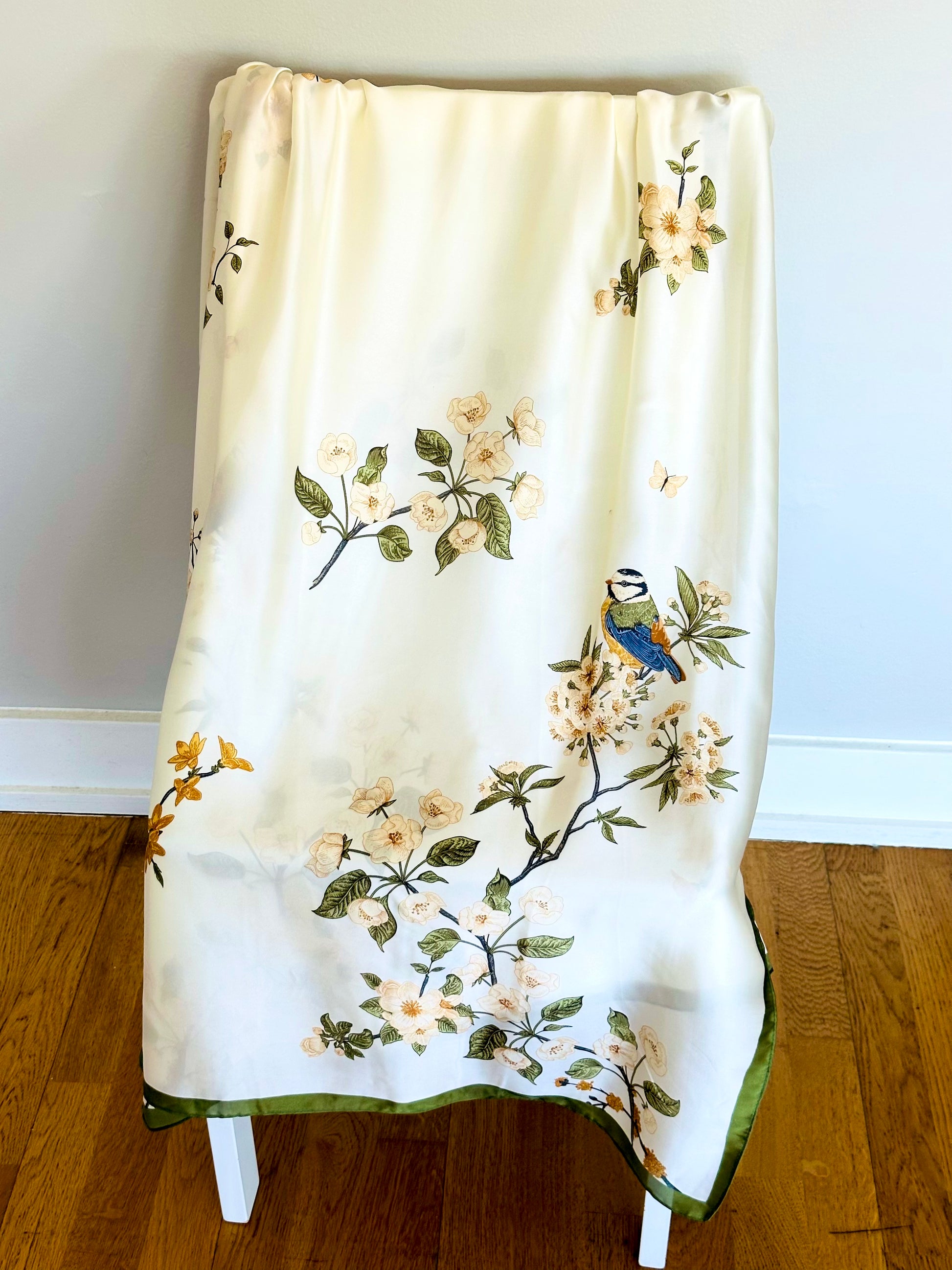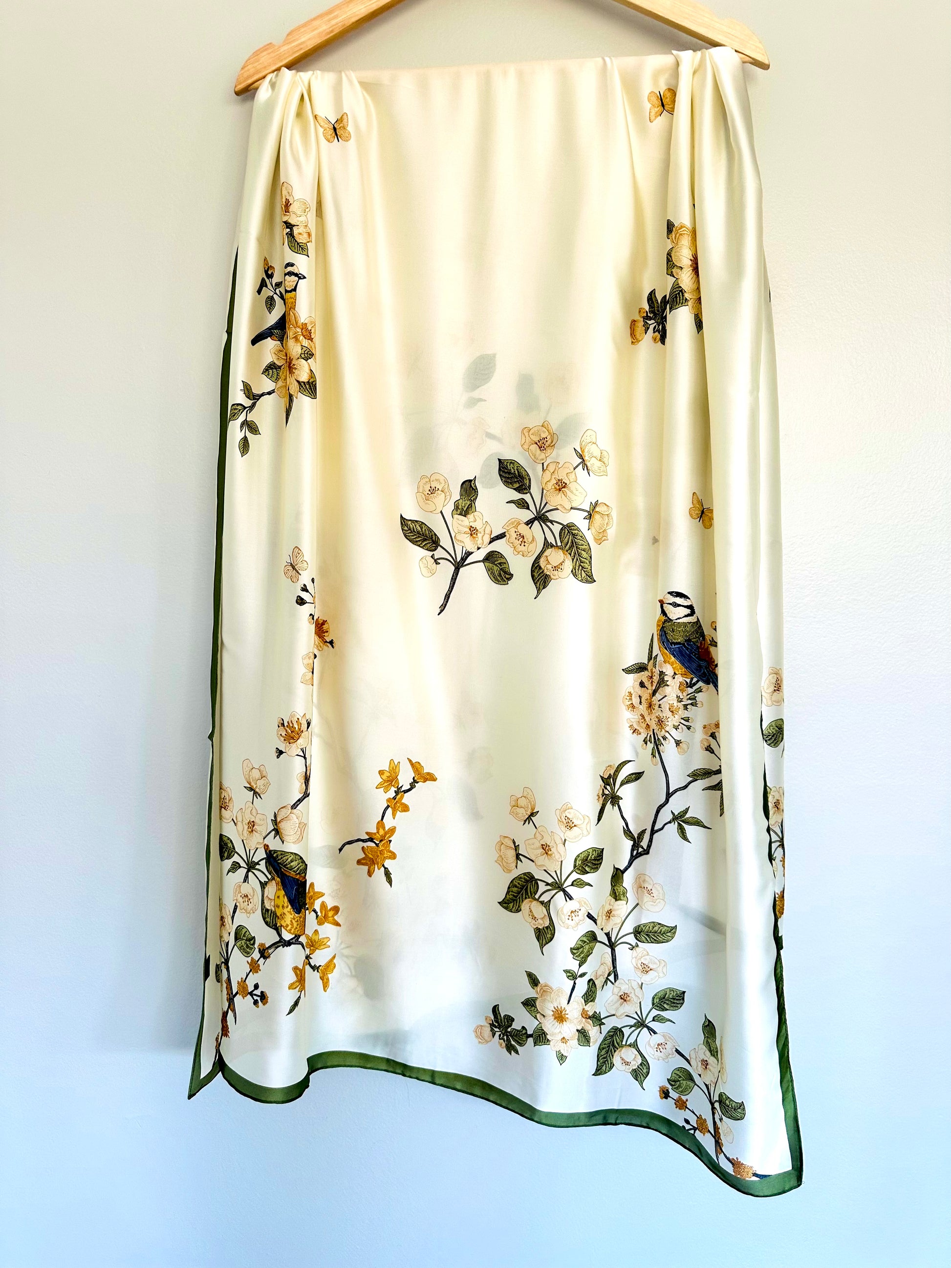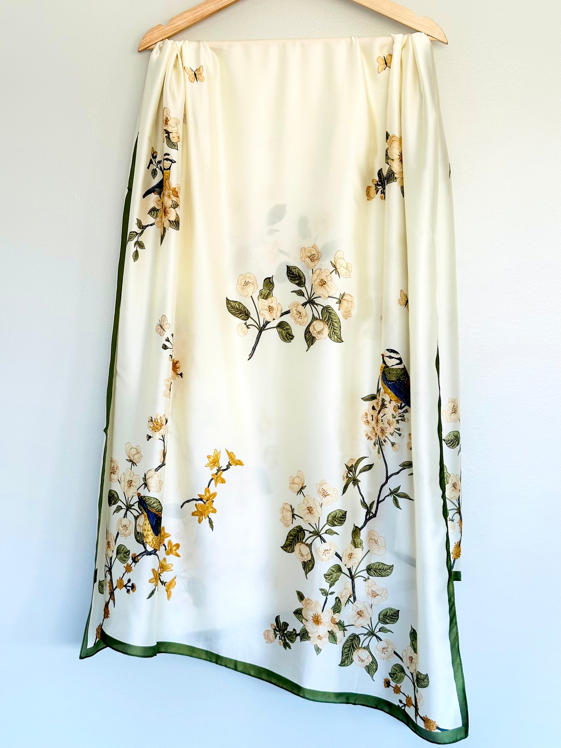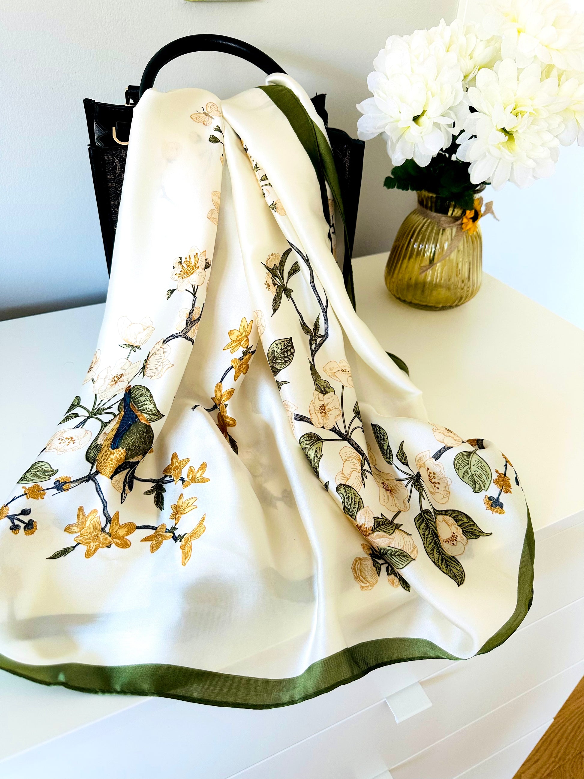 Step into nature’s embrace with the Printed Scarf in Lush Canopy. Inspired by the richness of nature, Lush Canopy envelopes you in deep green tones and organic prints. Rich green hues intertwine with soft leafy patterns, reminiscent of a peaceful forest under dappled sunlight. It’s earthy, grounding, and full of quiet strength.