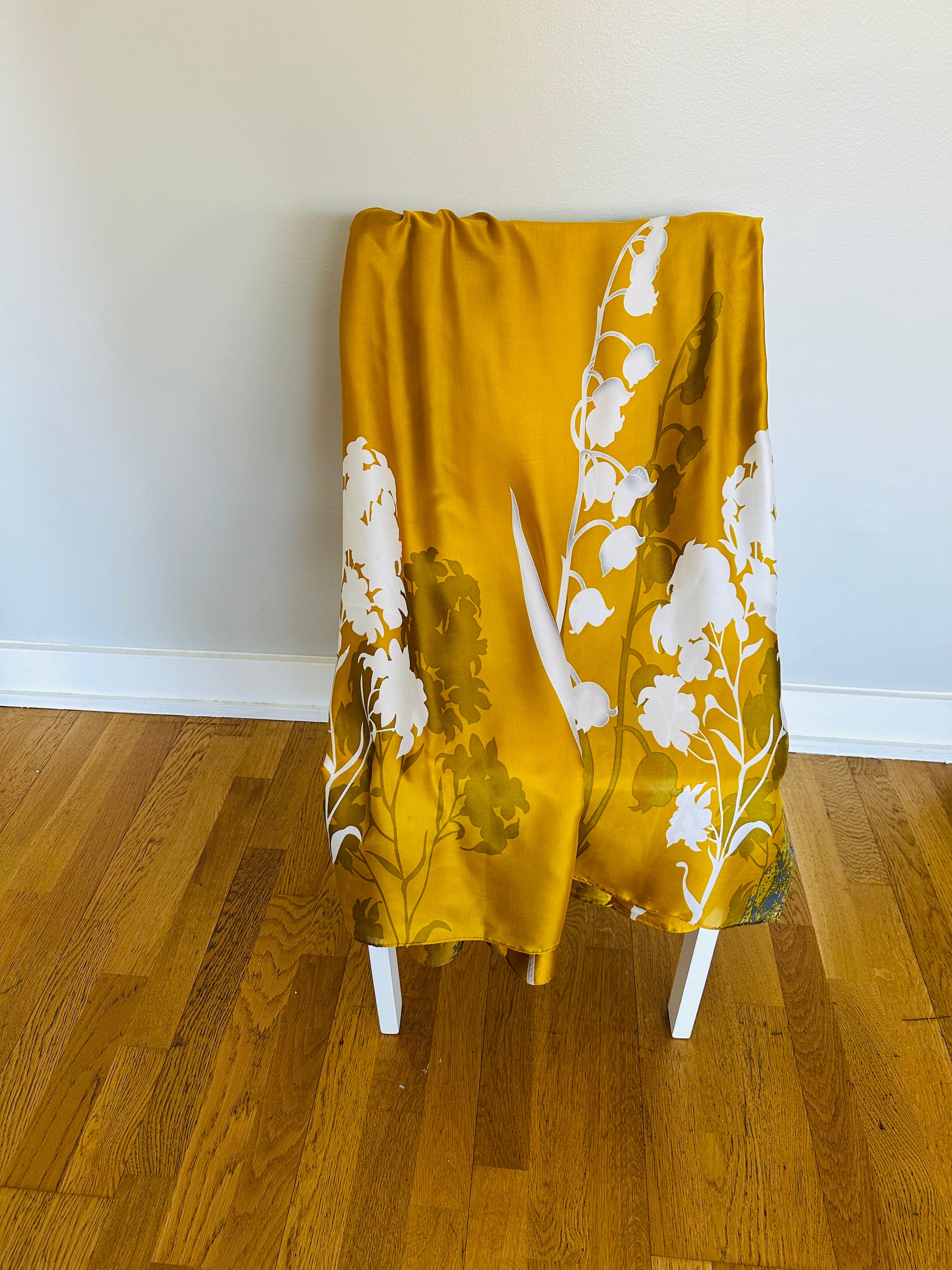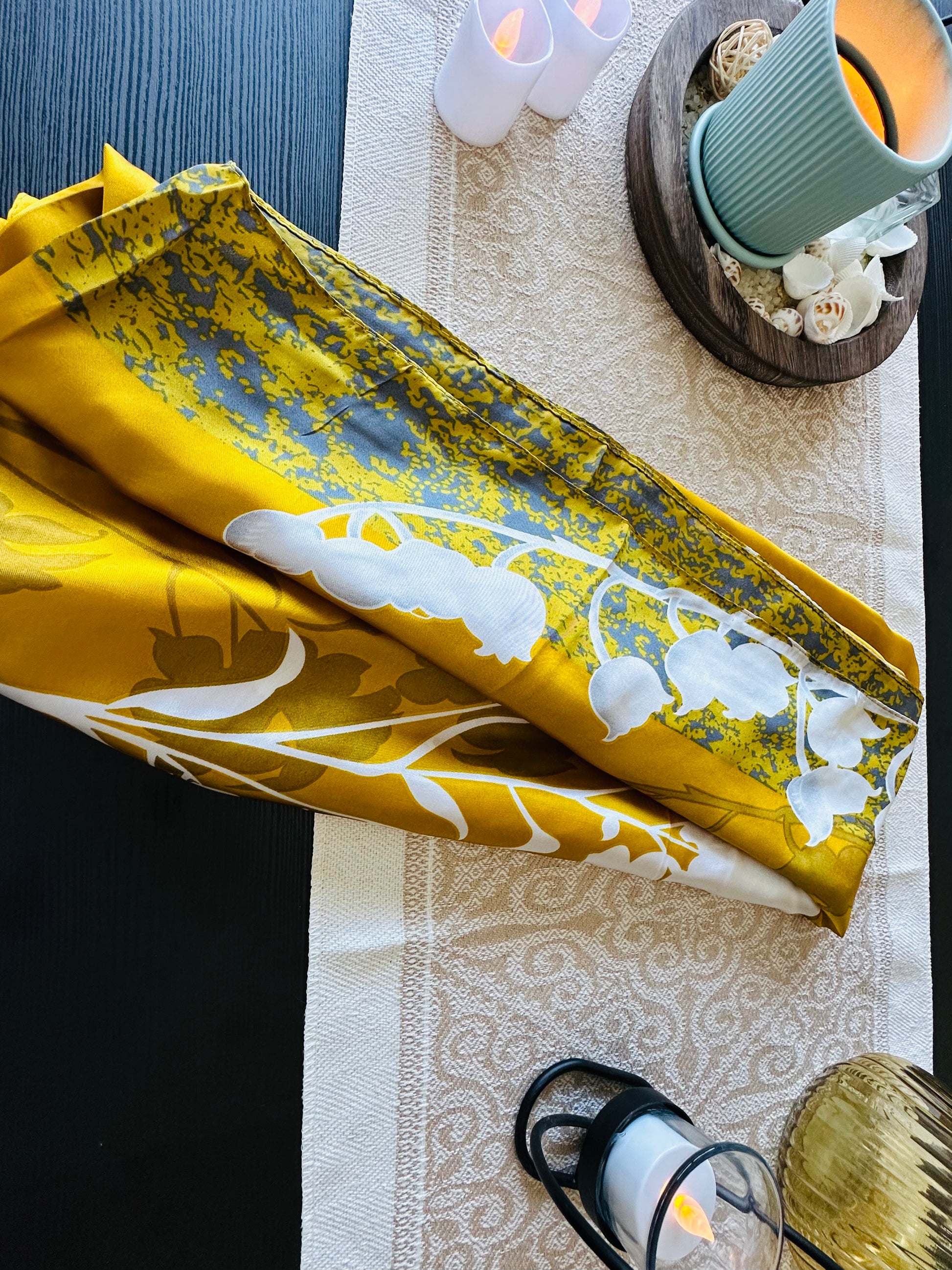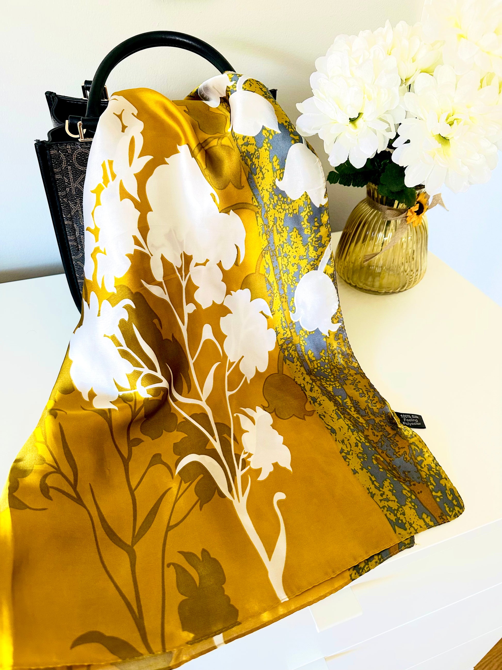 Radiating warmth and joy, Sunshine Bloom is your instant mood lifter. With its cheerful yellow hue and vibrant prints, this scarf brings brightness to even the simplest ensemble. This lively design fuses vibrant yellow tones with playful botanical elements, capturing the energy of golden hour and the joy of a sunlit meadow.